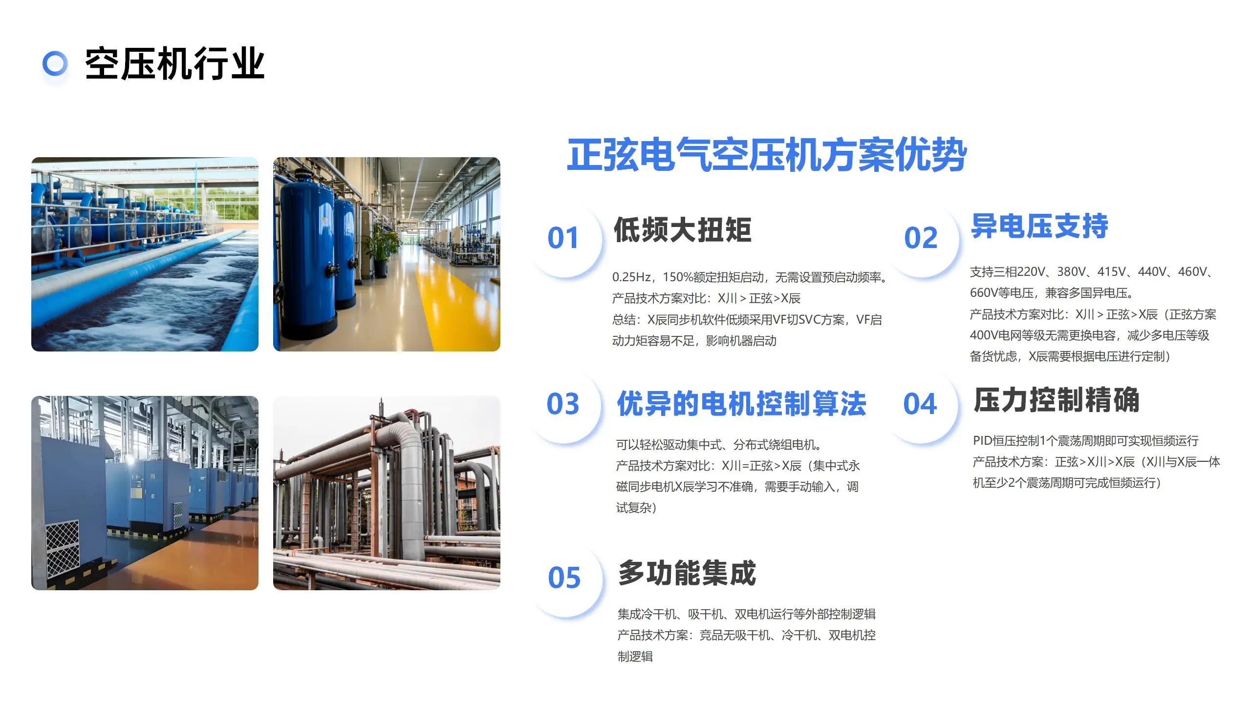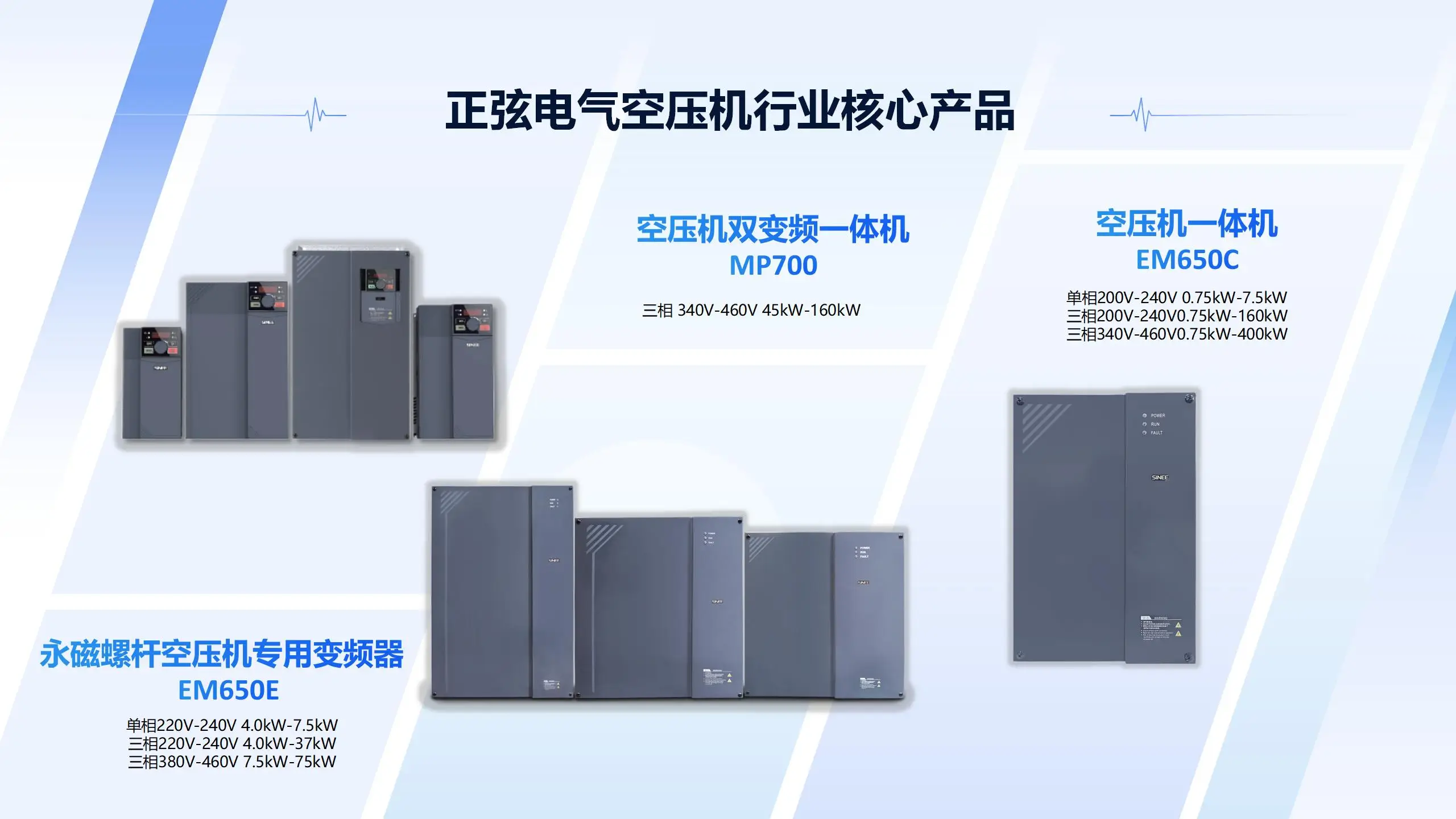 螺杆空压机是一种利用螺杆转子旋转来压缩空气的机械设备,广泛应用于工业生产中,用于提供压缩空气。英威腾根据螺杆空压机市场的发展趋势自主研发了空压机专用变频器,配套全面系统的空压机专用系统,其功能丰富、应用灵活简便、性能稳定、调试方便快捷等优点得到客户广泛认可。